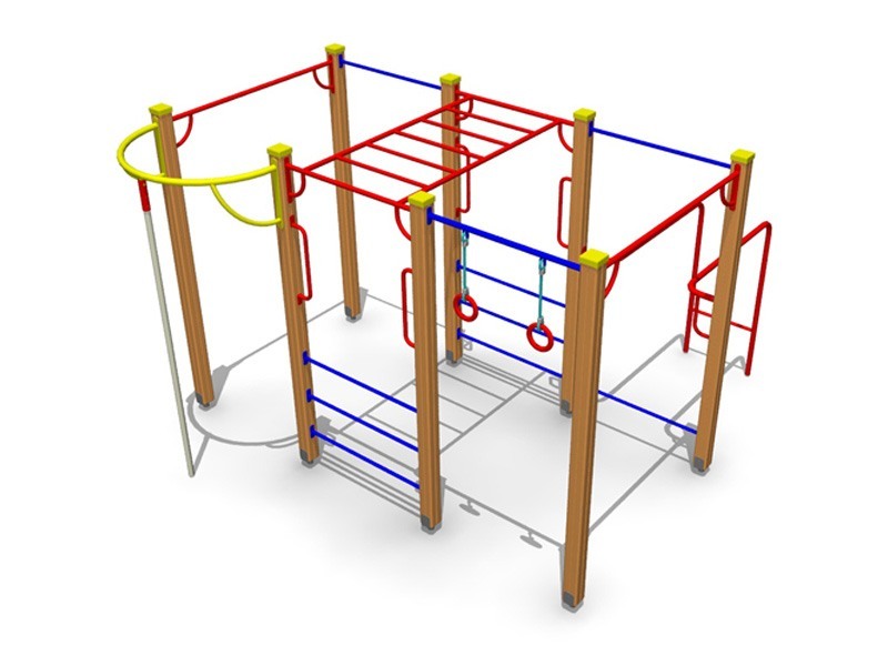 Гимнастический комплекс представляет собой сборноразборную, модульную конструкцию, состоящую из восьми опорных столбов, гимнастических брусьев, двух усиленных турников, рукохода, крепления каната, турника под гимнастические кольца,распорных турников, уличного каната, гимнастических колец и ручек-держателей. На вершины столбов устанавливаются пластиковые заглушки. Оборудование устанавливается и бетонируется на оцинкованные металлические подпятники. Возраст пользователя от 6 до 14 лет. Опорные столбы выполнены из клееного бруса сечением не менее 100*100 мм. с канавкой посередине. Металлические подпятники, крепление каната, и гимнастические брусья выполнены из круглой трубы сечением не менее 42 мм. и листового металла толщиной не менее 4 мм. Рукоход, усиленные турники и турник под гимнастические кольца выполнены из круглой трубы сечением не менее 34 мм. и листового металла толщиной не менее 4 мм. Распорные турники и ручки-держатели выполнены из круглой трубы сечением не менее 27 мм. и листового металла толщиной не менее 4 мм. Гимнастические кольца выполнены из влагостойкой фанеры толщиной не менее 24 мм. и полипропиленового каната с металлическим сердечником сечением не менее 16 мм. Уличный канат выполнен из полипропиленового каната сечением не менее 40 мм., круглой трубы сечением  не менее 42 мм., равнополочного уголка сечением не менее 25*25 мм. Все металлические и фанерные элементы выполнены с применением высокоточного оборудования. Деревянные элементы изготавливаются на полуавтоматизированной линии по обработке деревянных изделий. Все деревянные элементы изготавливаются из хвойной доски влажностью 7-10%, подвергаемой склейке по длине и ширине заготовки с применением клеев зарубежных производителей; изгибы, радиусы и скругленные кромки тщательно отшлифованы и обработаны краской для закрытия торцов JRM (ГОСТ Р 52169-2012 п.4.3.11). Все деревянные элементы проходят окраску в три слоя: первый слой – грунтование заготовки с последующим шлифованием поверхности, второй слой – покраска вододисперсионной краской с последующим шлифованием поверхности, третий слой – финишная покраска. Все деревянные элементы окрашиваются краской финского производителя TEKNOS, соответствующей требованиям санитарных норм и экологической безопасности. Все металлические элементы изготавливаются из круглых труб, с применением горячекатаного листа. Весь применяемый металлопрокат соответствует ГОСТ 8509-93, ГОСТ 10705-80, ГОСТ 1577-93. Сварные швы конструкций из металла гладкие (ГОСТ Р 52169-2012 п.4.3.10). Все металлические элементы окрашиваются порошковой краской финского производителя TEKNOS, соответствующей требованиям санитарных норм и экологической безопасности. Для более качественного прокраса все металлические элементы проходят двойной цикл покраски. Все фанерные элементы изготовлены из многослойной влагостойкой, склеенной под прессом и соответствующей ГОСТ 30427-96 фанеры; изгибы, радиусы и скругленные кромки тщательно отшлифованы и обработаны краской для закрытия торцов JRM (ГОСТ Р 52169-2012 п.4.3.11). Окраска фанерных элементов происходит в три слоя: первый слой – грунтование заготовки с последующим шлифованием поверхности, второй слой – покраска двухкомпонентной краской с последующим шлифованием поверхности, третий слой – финишная покраска. Все фанерные элементы окра